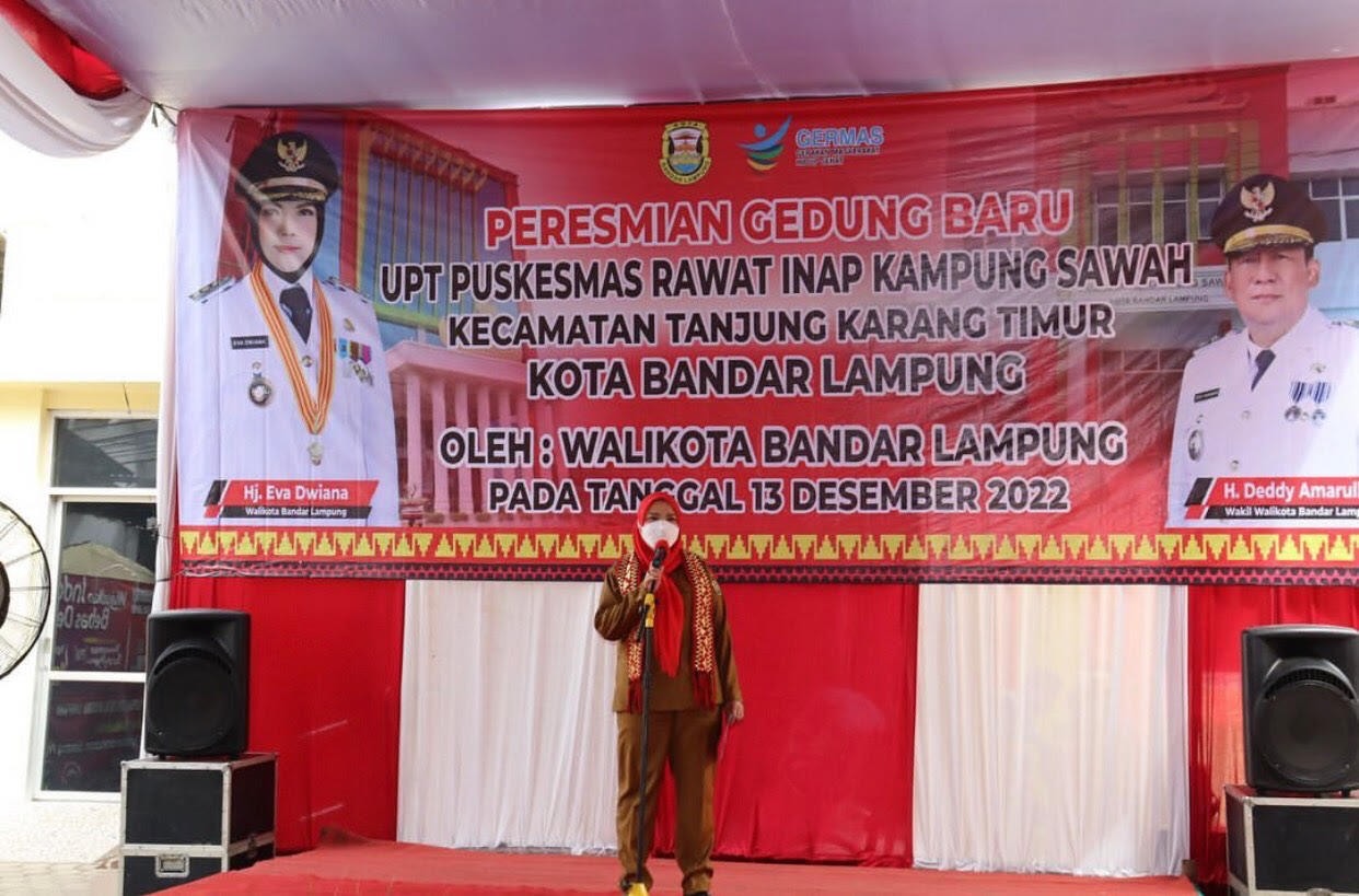 Walikota Bandar Lampung Hj.Eva Dwiana meresmikan gedung baru UPT.Puskesmas Kampung Sawah yang terletak di Kecamatan Tanjung Karang Timur Kota Bandar Lampung (Selasa,13 Desember 2022). Dengan diresmikan Puskesmas Kampung Sawah dari semula rawat jalan, setelah diresmikan gedung baru berubah menjadi pelayanan rawat inap.